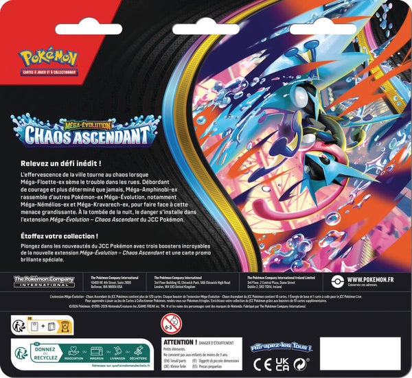 Plongez dans les nouveautés du JCC Pokémon avec trois boosters incroyables de la nouvelle extension Méga-Évolution - Chaos Ascendant et une carte promo brillante spéciale.